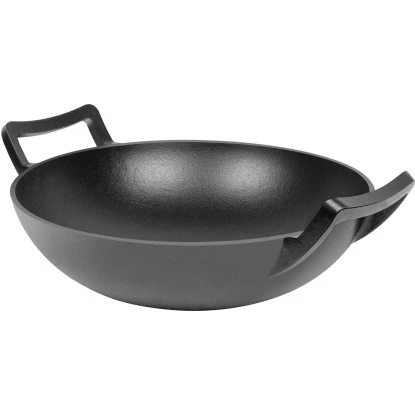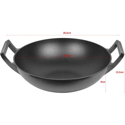 Hochwertiger El Fuego Wok aus massivem Gusseisen, der bereits mit planzlichen Ölen voreingebrannt ist. Optimale Wärmeleiteigenschaften dank einteiliger Bauweise. Zwei große Handgriffe erleichtern Ihnen die Handhabung. Mit planer Aufstandfläche und glatter Innenseite.