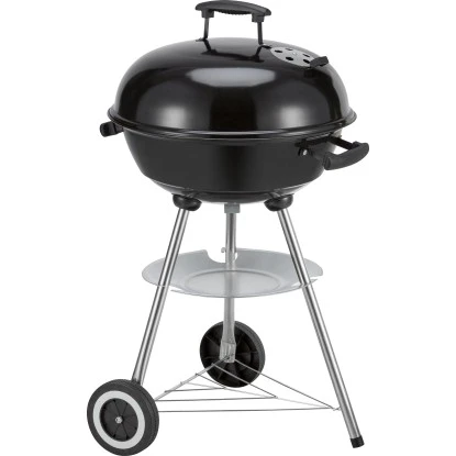 Der Holzkohle-Kugelgrill dient zum Garen von Grillgut im Garten oder auf der Terrasse. Durch seinen Kuppeldeckel eignet er sich gleichermaßen zum direkten oder indirekten Grillen. Ausgestattet ist er mit einem verchromten Grillrost, der einen Ø von 43,8 cm besitzt. Im Gestell integriert ist eine abnehmbare Ablagefläche für die Grillutensilien. Auch die Gestellverstärkung im Radbereich kann als Ablage genutzt werden. Der Deckel kann komplett abgenommen werden und bei Bedarf als Windschutz dienen. Er besitzt zudem eine verstellbare Entlüftung, die sich zur Temperaturregulierung der Grillkammer eignet. Zur einfachen Platzierung besitzt der Gartengrill zwei große Räder. Seine Maße betragen 85 cm x 55 cm x 52 cm (H x B x T).