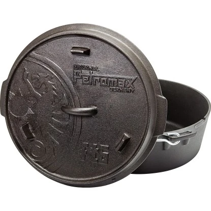 Durch die hervorragenden Eigenschaften des Gusseisens und die spezielle Oberflächenstruktur wird die Wärme effizient gespeichert und weitergeleitet. Die vorbehandelte Oberfläche (seasoned finish) macht ein erstmaliges Einbrennen unnötig und der robuste Feuertopf kann sofort verwendet werden. Im Freien wird er auf dem offenen Feuer oder mit Holzkohle und Briketts verwendet. Der erhöhte Rand des Deckels ermöglicht es, Glut oder Holzkohle auch auf dem Feuertopf zu platzieren. So wird der Feuertopf von allen Seiten beheizt und eignet sich beispielsweise auch zum Brot backen.