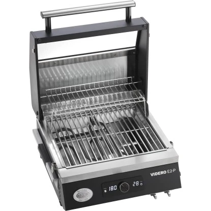 Der Rösle Elektrogrill Videro E2-P erreicht bei einer Leistung von 2.800 Watt eine Grilltemperatur von 120 °C bis 300 °C. Die Bedienung und Temperatureinstellung erfolgt ganz einfach über einen Drehregler. Die Brennkammer, der zweiteilige Grillrost, das Warmhalterost und die seitlich herausnehmbare Fettauffangwanne sind aus Edelstahl und somit einfach zu reinigen.