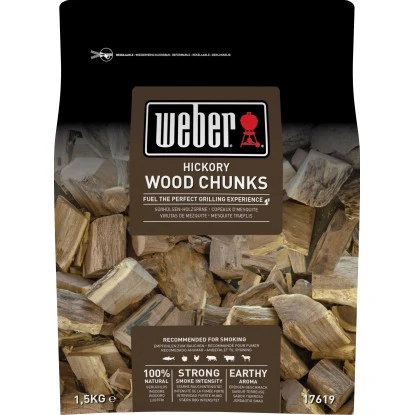 Die Weber Chunks sind grössere Holzstücke, die langsamer brennen und ihr feines Räucheraroma über eine längere Zeit abgeben. Aroma: Hickory, Beutelinhalt: 1,5 kg.