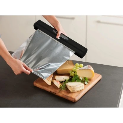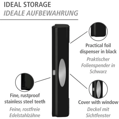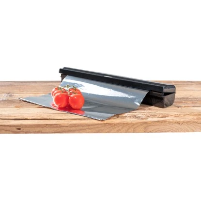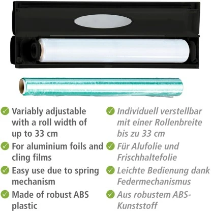 Der Wenko Folienspender Perfect Cutter Black Outdoor Kitchen Schwarz, der in Ihrer Outdoorküche für BBQ, Brunch und Grillevent nicht fehlen sollte. Mit den Utensilien der Reihe Black Outdoor Kitchen gibt Wenko Ihnen das rundum Paket an Koch-, Grill- und Küchenhelfern an die Hand, die Ihre Außenküche noch funktionaler macht. Mit dem Folienspender Perfect Cutter 1-Klick in elegantem Schwarz haben Alufolie und Frischhaltefolie zukünftig einen überaus praktischen Platz. Mit dem Abroller gehört zerrissene Alufolie oder verklebte Frischhaltefolie der Vergangenheit an. Geeignet für alle handelsüblichen Rollen bis 33 Zentimeter ermöglicht der Folienspender mit Sichtfenster im Deckel einen einfachen Abriss. Dabei kann das handliche Küchenutensil mit nur einer Hand bedient werden. Einfach die Folie herausziehen, auf Spannung halten und den Spender zusammendrücken, die fein gezahnte Edelstahl-Klinge im Deckel trennt sie dank des Federmechanismus, mit dem der Folienschneider ausgestattet ist, sauber ab.