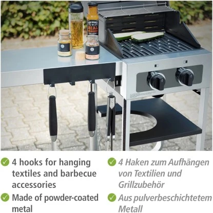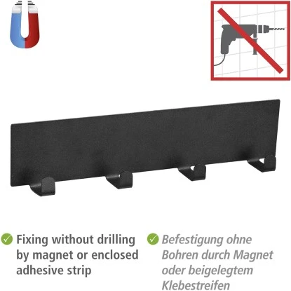 Die magnetische Hakenleiste Ima mit 4 Haken in Schwarz von Wenko ist aus schwarzem, pulverbeschichtetem Metall gefertigt. Das robuste Material ist widerstandsfähig und eignet sich ideal für den Outdoor-Bereich Ihrer Außenküche. Ausgestattet mit vier Haken, haben Sie Grillzange, Pfannenwender & Co. bei Bedarf schnell griffbereit und ordentlich am Grill aufbewahrt. Auch das Geschirrtuch und Grillhandschuhe finden hier einen ansprechenden Platz in der Nähe des Grills. Die Leiste mit Haken ist magnetisch und kann schnell und bequem an einer Metallfläche befestigt werden – das hält Ihnen die Arbeitsplatte für Öl- und Essig sowie Gewürze frei. Alternativ können Sie die Halterung mit dem im Lieferumfang enthaltenen doppelseitigen Klebeband an der gewünschten Stelle anbringen.